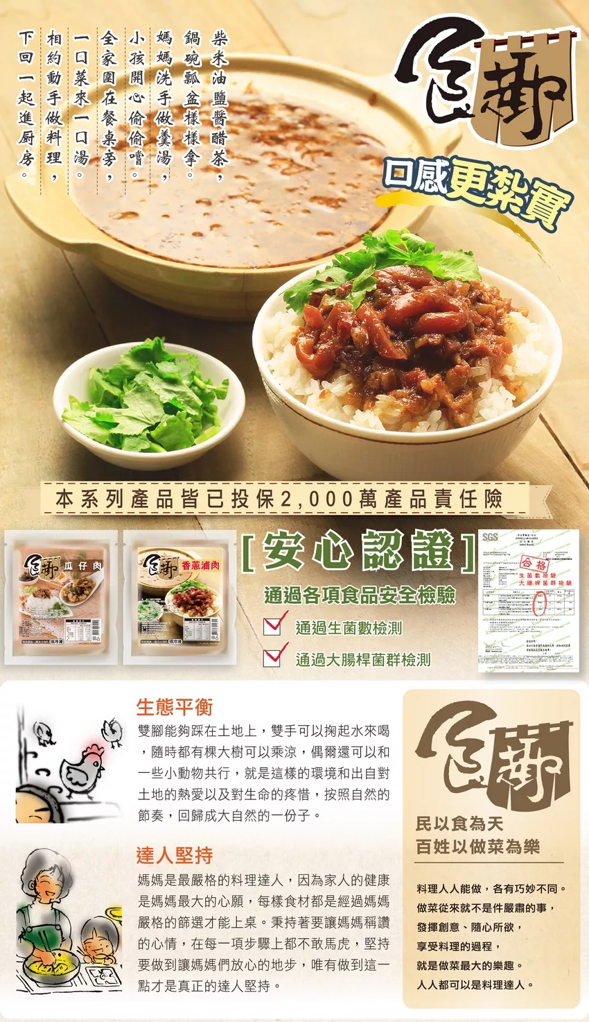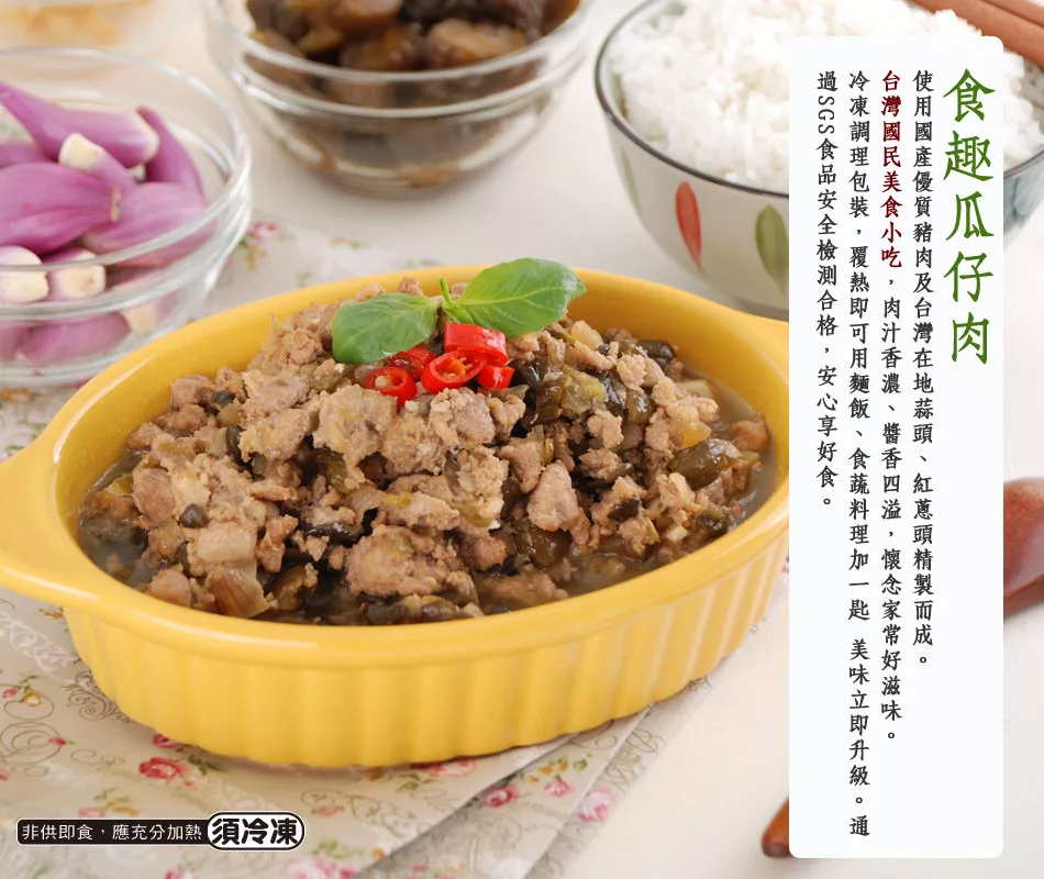 冷凍調理包裝,覆熱即可食用;麵飯、食蔬料理加一匙~美味升級;通過SGS食品安全檢測合格,安心享好食;快速又方便的人氣美食,三餐+宵夜皆宜,讓您無法忘懷的傳統美味。
